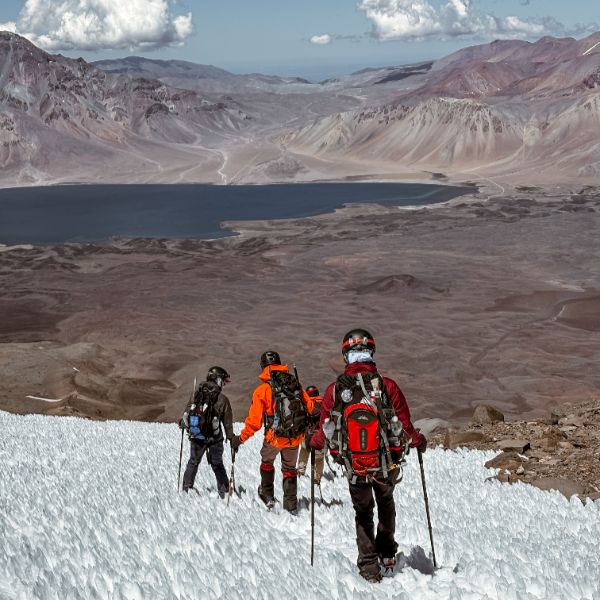 Durante todo el recorrido tendremos increíbles vistas a la Laguna del Diamante y la cordillera, realizaremos un transito glaciar sobre el cráter del volcán para acceder a la cumbre.